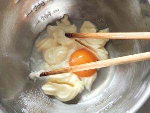 ![]() ⑥ボールに、砂糖、マヨネーズ、卵黄、レモン汁を加えてよく混ぜましょう。 |