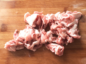 ⑤フライパンに少し多めに油(分量外)を引き、弱火で豚肉が白くなるまで炒めます。