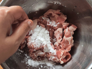 ②ボールに豚肉と片栗粉を入れ、手でよく片栗粉をもみこみましょう。