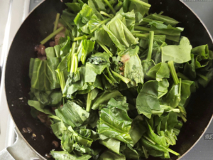 ⑦ほうれん草も加え、少し火を強めにして、ほうれん草がしんなりするまでさっと炒めます。