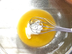 ![]() ①耐熱ボールにマーガリンを入れ、レンジで20秒ほど加熱して溶かします。 |