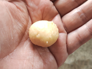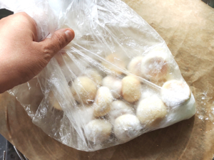![]() ⑤生地を一つずつ手に取り、親指よりやや大きな3cmくらいに丸めます。 |