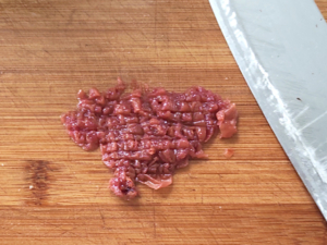 ![]() ⑤梅干は種を取り、包丁でたたきます。 |