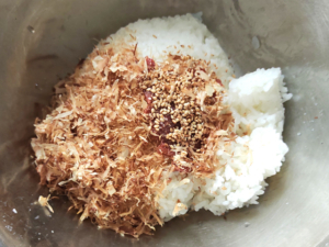 ![]() ⑥ボールなどに温かいご飯、梅干し、ごま、鰹節を入れて、しっかりと混ぜ合わせます。 |