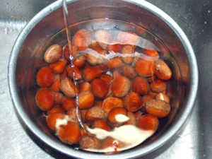 ![]() ①栗は汚れを洗い、たっぷりの水に2時間漬け込みます。 |