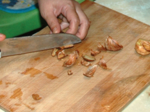 栗の平らな面に沿って、軽く切り落とすことで、すき間に包丁を入れて、くるっと回せば鬼皮も簡単にむけます。