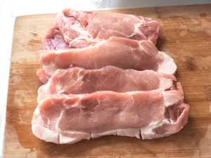 ![]() ①豚肉は、脂身と赤身に垂直に包丁を入れておきます。 (筋切り) |