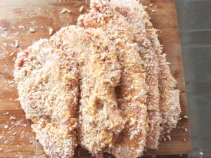 ![]() ②肉に、薄力粉→溶き卵→パン粉の順に衣をつけましょう。 |