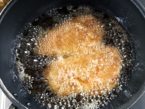 ![]() ③180度くらいの油で、肉がきつね色になるまで揚げます。 |
