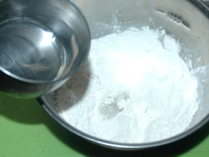 ![]() ②水を少しずつ加えながら、耳たぶくらいの柔らかさになるまで練りましょう。 |