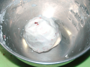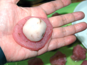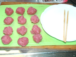 ![]() ⑥団子をゆでている間に、桜餡は20~24gずつくらいの餡玉を作ります。 ⑦竹串は水に漬けておきましょう。 |