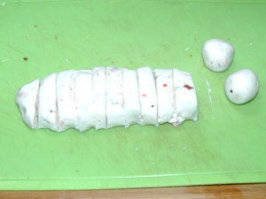 ![]() ④生地を12等分し、それぞれ丸めて団子を作ります。 |