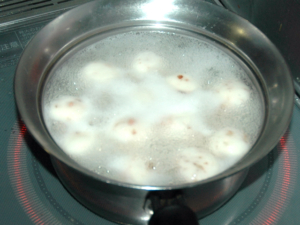 ![]() ⑤お湯を沸かし、団子をゆで、浮いてきたら、更に2~3分ゆでましょう。 |