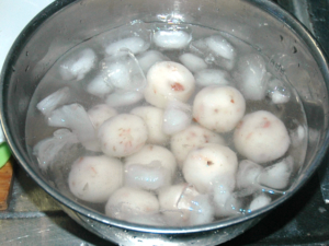 ![]() ⑧茹で終わった団子は、氷水に入れてしっかりと冷やします。 |