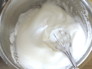 ![]() ①卵黄と卵白を別々のボールに入れます。 ②卵白に砂糖を一つまみ加えて泡立て始め、途中二回に分けて砂糖を加え、ピンと角が立つまで泡だててメレンゲを作りましょう。 |