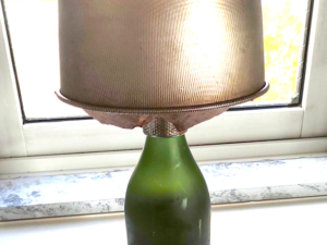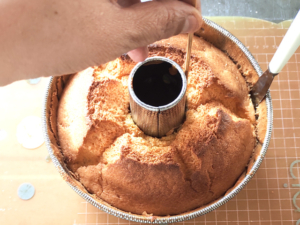 ![]() ⑪ケーキが焼けたら、すぐに逆さにして、瓶などに挿し、このまま2時間以上放置します。 |