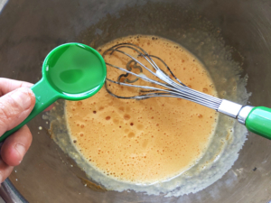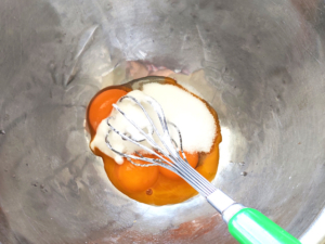 ![]() ③卵黄のボールに砂糖を加えて泡立て、白っぽくとろりとするまで泡だてます。 |