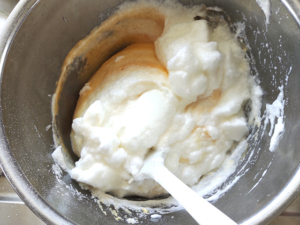 ![]() ⑦卵黄のボールにメレンゲを加え、ゴムべらに持ち替えて、さっくりと練らないように混ぜます。 |