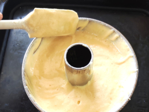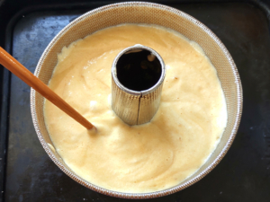 ![]() ⑧型に生地を流しいれ、筒部分を押さえて、二回ほどトントン落として空気を抜きます。 ⑨箸をケーキ内で、くるくる回しながら一周させ、中の気泡も取り除きましょう。 |