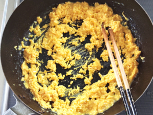 ![]() ②フライパンをよく熱し、薄く油(分量外)を引いたら、卵液を加え、箸でほぐしながら、炒り卵を作ります。 ③できたら、取り置きましょう。 |
