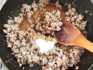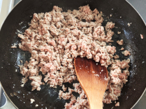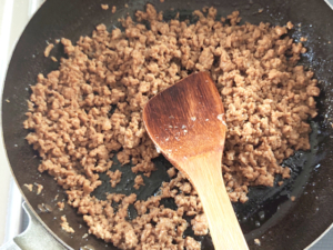 ![]() ⑤ひき肉を加え、木べらでほぐしながら、白くぽろぽろになるまで炒めましょう。 |