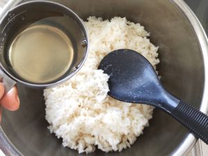 ![]() ①ボールか飯台にご飯を入れ、カンタン酢を回しかけます。 ②混ぜたら、うちわであおぐを繰り返して、人肌よりやや冷たいくらいまでしっかりと冷やしましょう。 (混ぜながら冷やすと団子になるので注意!) |