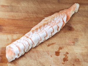 ![]() ③サーモンの刺身は、斜めそぎ切りにします。 |