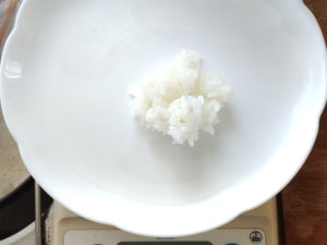 ![]() ④酢飯を白トレーや小さめの皿に乗せ、23~25gくらいになるように1個の酢飯を計ります。 |