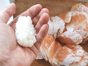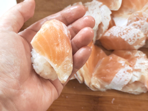 ![]() ⑥切ったサーモンを乗せ、軽く上下に握り返します。 |