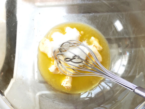 ![]() ①耐熱ボールにマーガリンを入れ、レンジで20秒ほど加熱して溶かします。 |