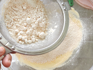 ![]() ③ボールに薄力粉ときなこ、アーモンドパウダーを一緒にふるい入れ、ゴムベラで練らないようにさっくりと混ぜます。 |