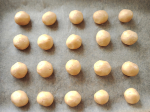 ![]() ⑥天板にクッキングシートを敷き、丸めた生地を間隔を開けて並べます。 (膨らむ心配はないので、隙間はさほど必要ありません。) |