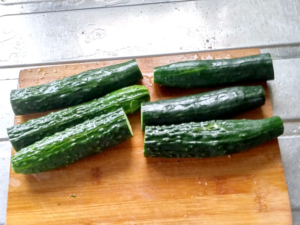 ![]() ①きゅうりは両端を少しきり落とし、麺棒などで叩いて、軽く割れるようにします。 (割って味を染みやすくします。) |