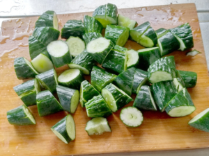 ![]() ②きゅうりは割った後、乱切りにしましょう。 |