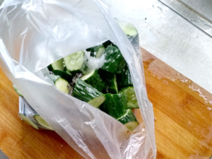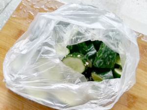 ![]() ③ポリ袋にきゅうり、塩昆布、砂糖、酢、めんつゆを入れ、ゆすりながら、袋の上から良く揉みこみます。 |