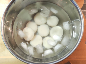 ![]() ⑥ゆでたもちを氷水の入ったボールに入れ、しっかりと冷やしましょう。 |