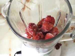 ![]() ①氷も砕けるミキサーに、冷凍いちごを入れます。 (できれば、軽くほぐし、少しくっつきを直しましょう。) |