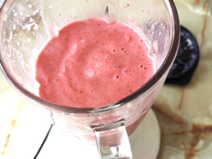 苺がくっつきすぎていると、ミキサーが回らなくなるので、固まりを小さくしてからミキサーにかけてください。