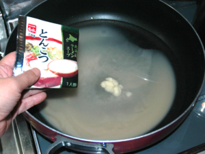 ![]() ①大きめの鍋に、水とにんにく、ラーメン用のとんこつスープを入れて火にかけ、一旦沸騰させます。 |