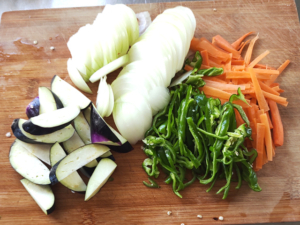 ①玉ねぎは皮をむいて薄切りに、人参は皮をむいて千切りに、ピーマンは種とヘタを取って細切りに、ナスはヘタを取って斜め薄切りにします。