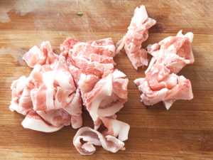 ④豚こまは食べやすい長さに切ります。