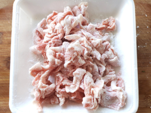 ⑤豚こま全体に片栗粉をまんべんなくまぶします。