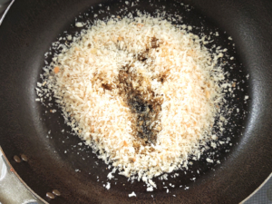 ![]() ①フライパンにパン粉と油を入れ、中火できつね色になるまで炒めます。 |