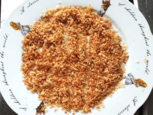 ![]() ②できたパン粉は、平らな容器に移し、粗熱を取っておきましょう。 |