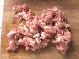 ![]() ③豚こま肉は、食べやすい大きさに切ります。 |