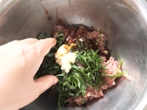 ![]() ④ボールに、豚こま、千切りにした青じそ、マヨネーズ、トンカツソース、醤油、ガムシロップを加え、軽く粘りが出るまでしっかりと練ります。 |