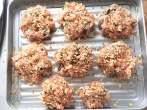 ![]() ⑤タネができたら8等分し、手のひらの上で成形します。 ⑥全てのタネの両面に、パン粉を多めにまぶしましょう。 |