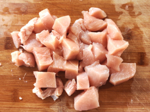 ![]() ①鶏むね肉は、大きめの一口大に切ります。 |