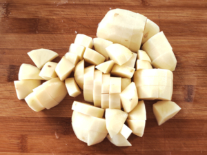 ![]() ⑩じゃがいもは皮をむき、小さめの一口大に切ります。 ⑪耐熱皿に水をくぐらせたじゃがいもを並べ、ラップをしてレンジで10分ほど加熱しましょう。 |