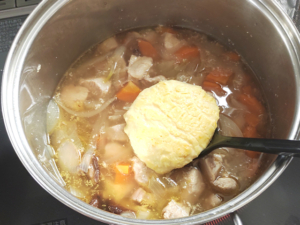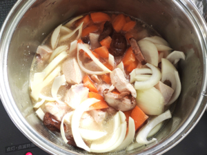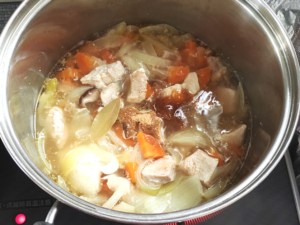 ![]() ④鍋に水を加え、野菜も加えて煮始めましょう。 |